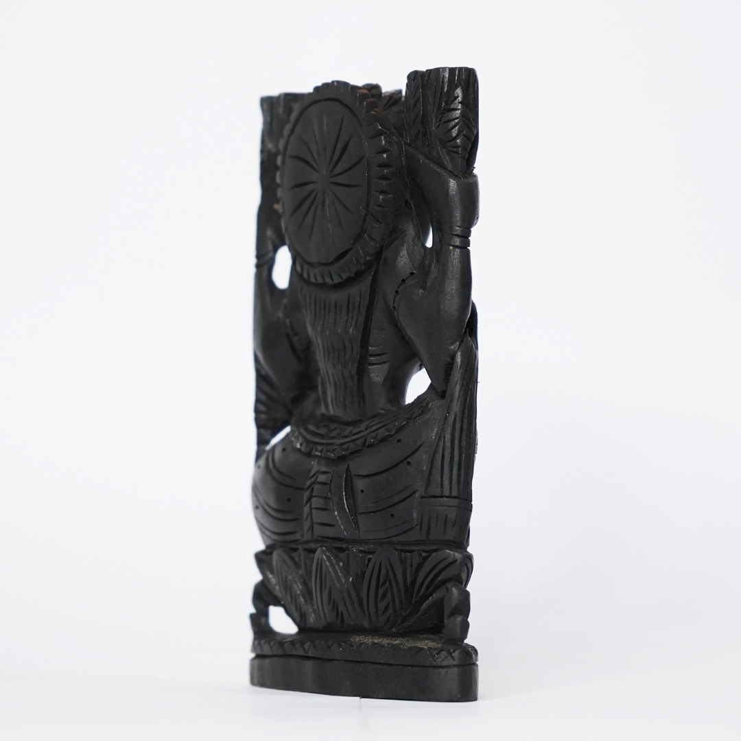 Invite wealth, prosperity, and divine grace into your home with this sacred Goddess Mahalakshmi statue, exquisitely hand-carved from auspicious Karungali (Black Ebony) wood. Goddess Mahalakshmi, the deity of wealth and abundance, blesses devotees with financial prosperity, spiritual well-being, and harmony. Karungali wood is known for its ability to dispel negative energies and attract positive vibrations. Material: Authentic Karungali wood. Height: 4 inches. Width: 2.2 inches. Weight: Approx. 60 grams. Ideal for pooja rooms, offices, shops, lockers, and gifting. Placing this statue is believed to attract prosperity, success, and peace while protecting from negative energies. Its compact size makes it perfect for daily worship and easy placement anywhere.